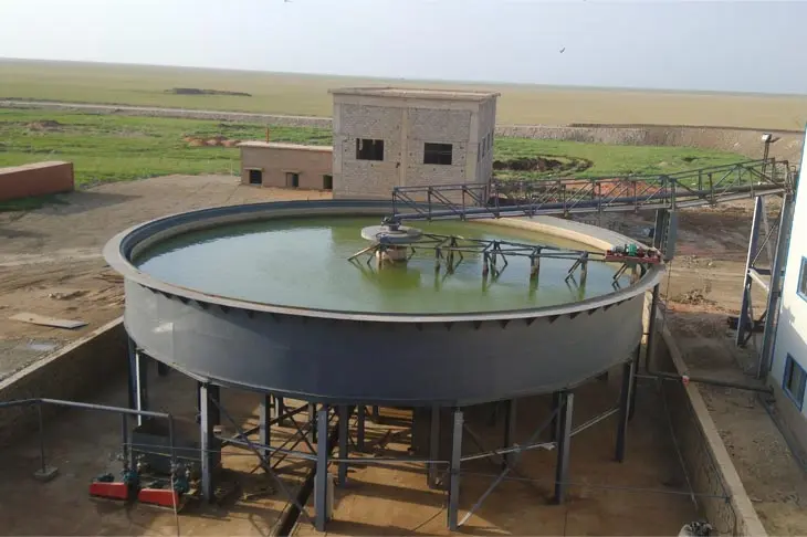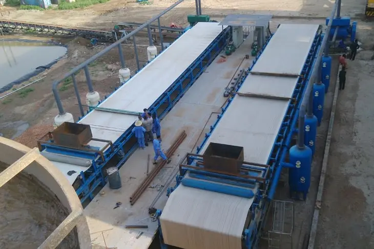 Tailings dry discharge: Because the mine muddy is serious, there’s higher mud content, after the leaching of the tailings first into the mixing tank, adding flocculant, to a certain concentration, transported to the belt vacuum filter, the solid-liquid separation, get less than 20% moisture dry ore. Filtrate recycling, to achieve zero discharge of sewage.